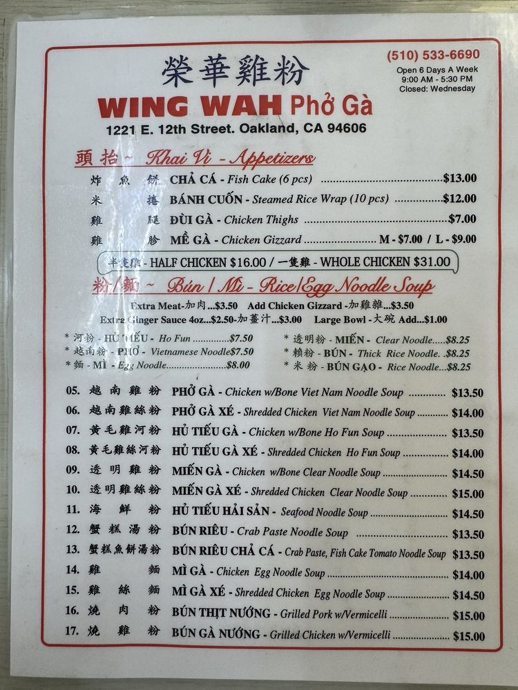 Welcome to Wing Wah Pho Ga, a delightful Vietnamese noodle spot located at 1221 E 12th St, Oakland, CA. This women-owned eatery specializes in authentic pho ga, renowned for its flavorful broth and juicy chicken. The half chicken option with fresh ho fun noodles captivates diners, as highlighted by many satisfied customers.